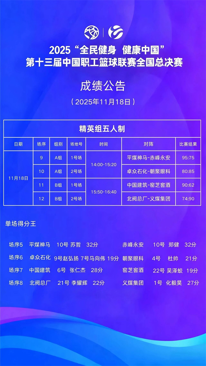 11月18日,2025年“全民健身 健康中国”第十三届中国职工篮球联赛全国总决赛第三轮比赛结束,精英组、超级组赛果如下: