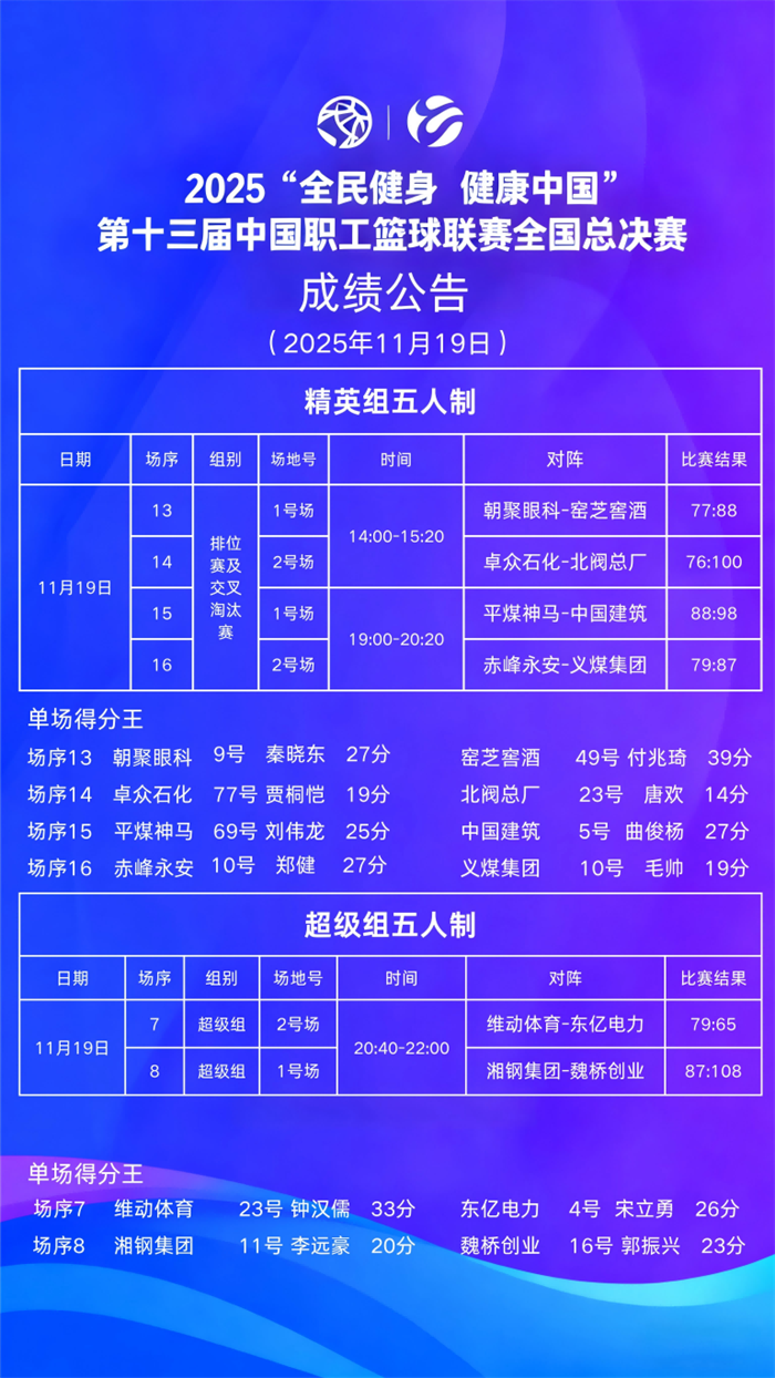 11月19日,2025年“全民健身 健康中国”第十三届中国职工篮球联赛全国总决赛第四轮比赛结束,精英组、超级组赛果如下: