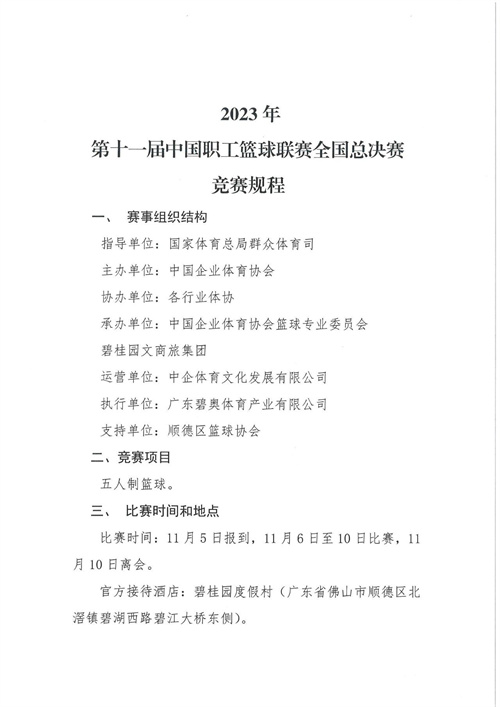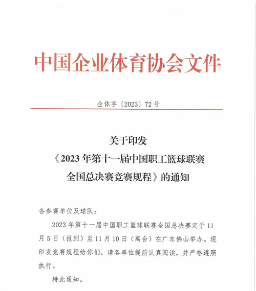 2023年第十一届中国职工篮球联赛全国总决赛定于11月5日(报到)至11月10日(离会)在广东佛山举办。现印发竞赛规程给你们,请各单位提前认真阅读,并严格遵照执行。