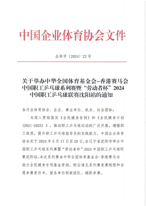 关于举办中华全国体育基金会-香港赛马会中国职工乒乓球系列赛暨“劳动者杯”2024中国职工乒乓球联赛沈阳站的通知