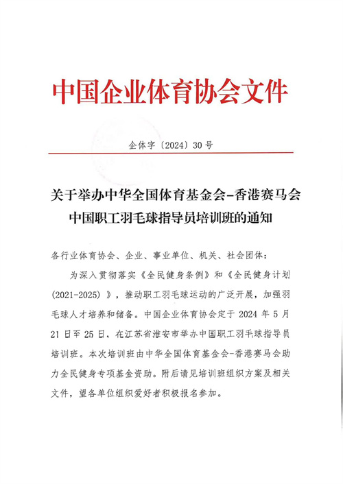 关于举办中华全国体育基金会-香港赛马会中国职工羽毛球指导员培训班的通知