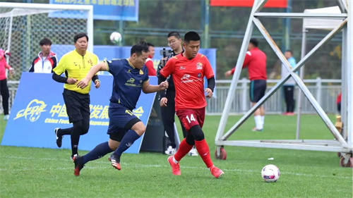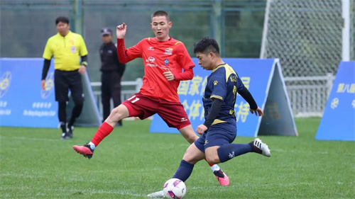 图注:胡杨河军垦新城足球队11号海那尔.达胜防守封堵射门。