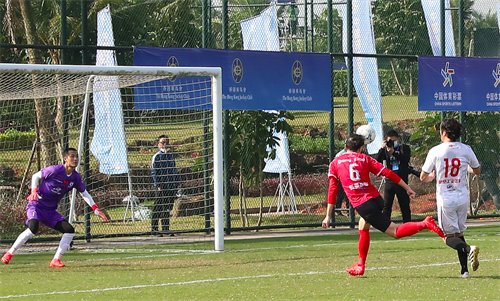 图注:总决赛11人制首场比赛,上汽通用五菱(红)破门瞬间。