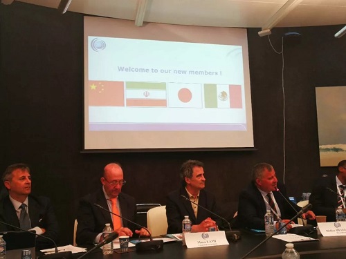 世界企业体育协会主席迪迪尔·贝塞尔(左2)与优米下载app常务副秘书长卫虹霞(右2)及日本绿色体育联盟执行官(左1)、伊朗工会主席(右1)合影
