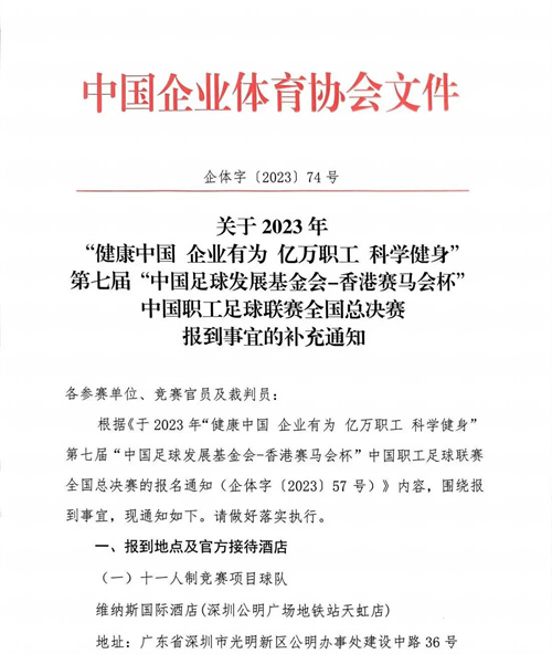 2023年第七届“中国足球发展基金会-香港赛马会杯”中国职工足球联赛全国总决赛报道事宜的补充通知