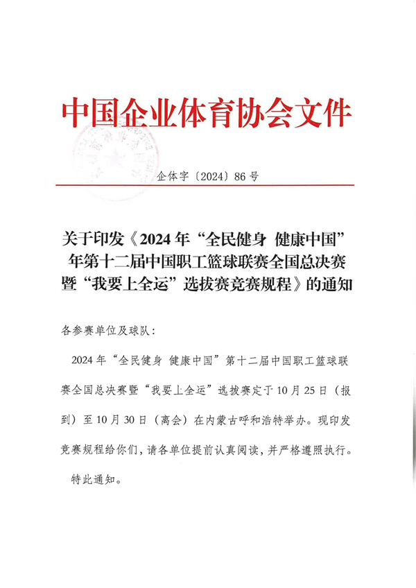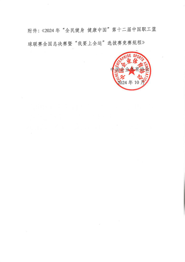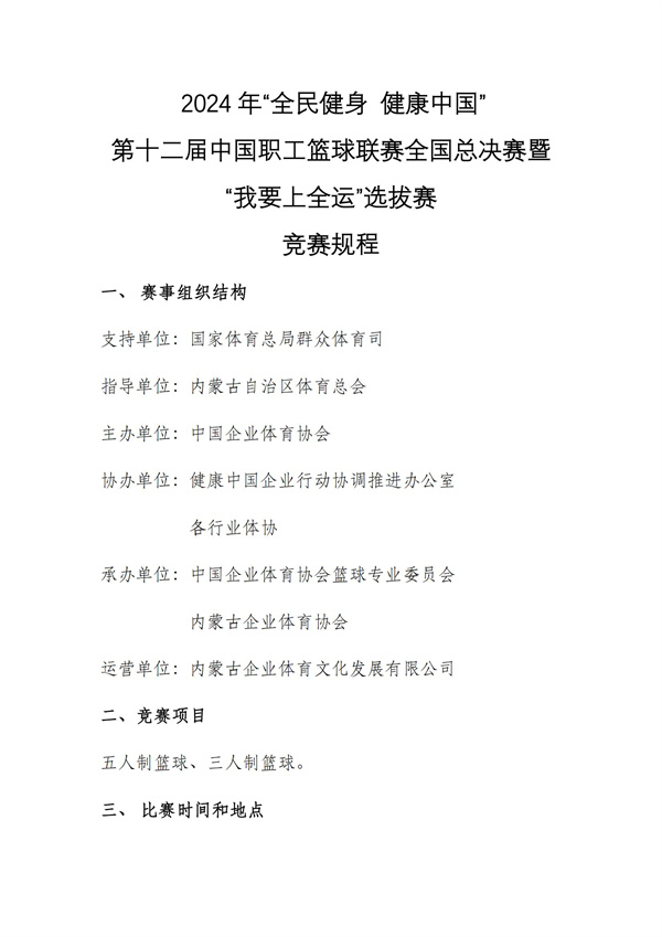 关于印发《2024年“全民健身 健康中国”第十二届中国职工篮球联赛全国总决赛暨“我要上全运”选拔赛竞赛规程》的通知