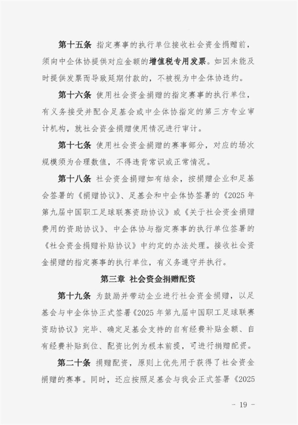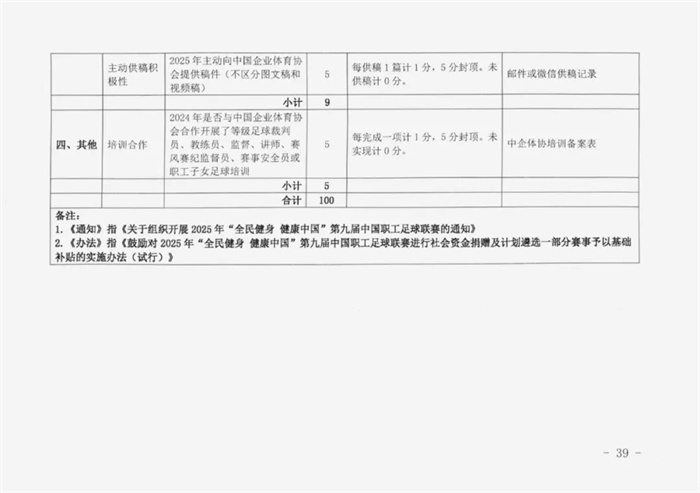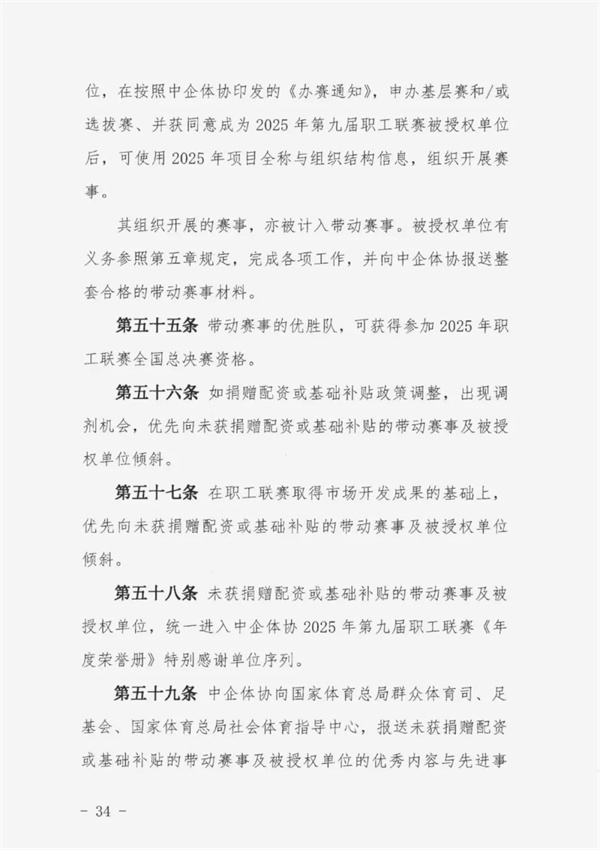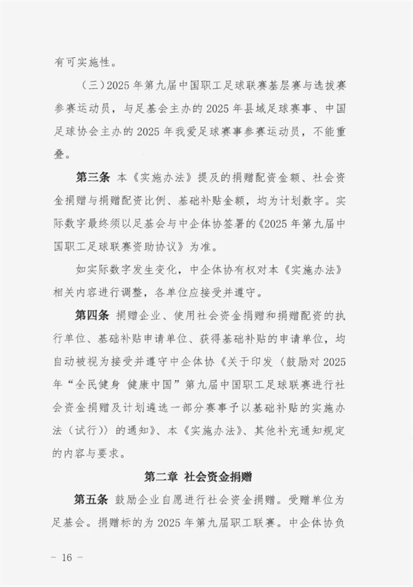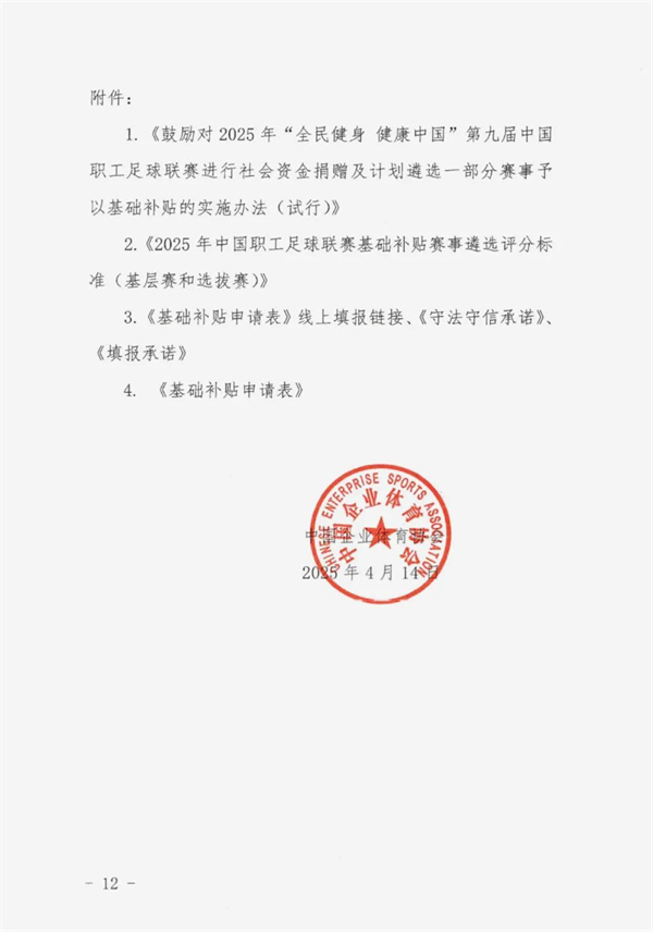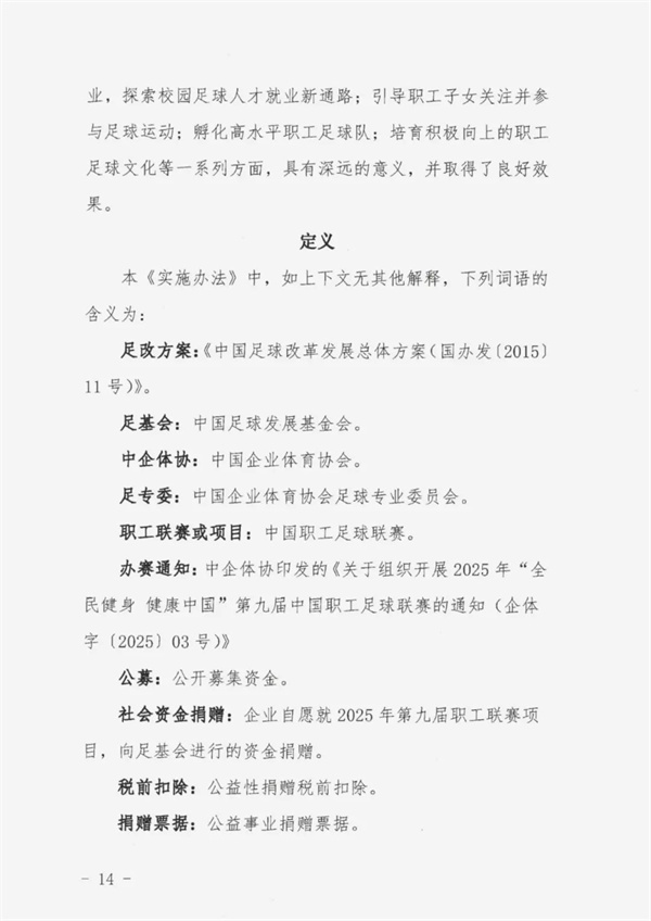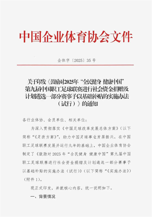 1、关于印发《鼓励对2025年“全民健身 健康中国”第九届中国职工足球联赛进行社会资金捐赠及计划遴选一部分赛事予以基础补贴的实施办法(试行)》的通知