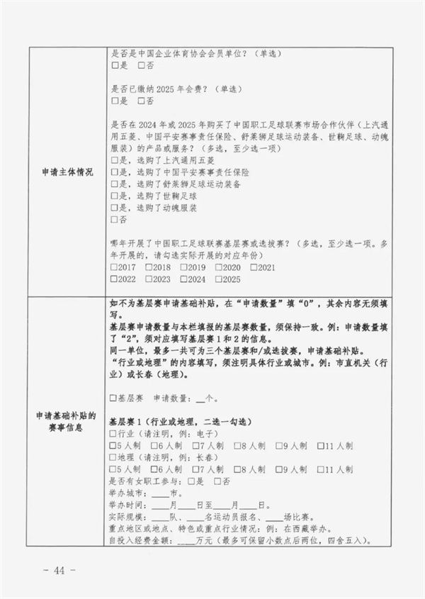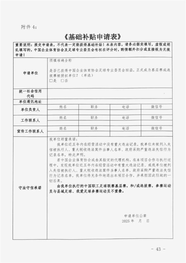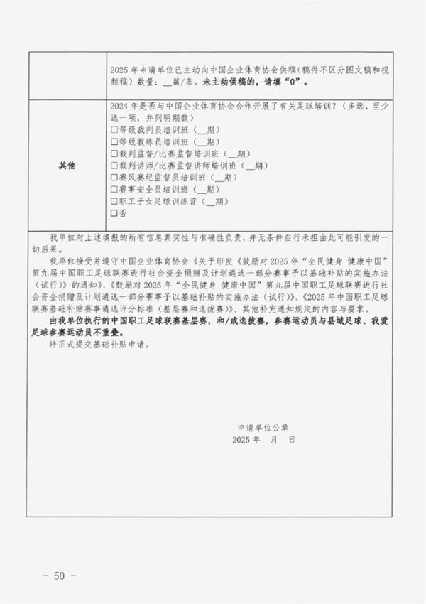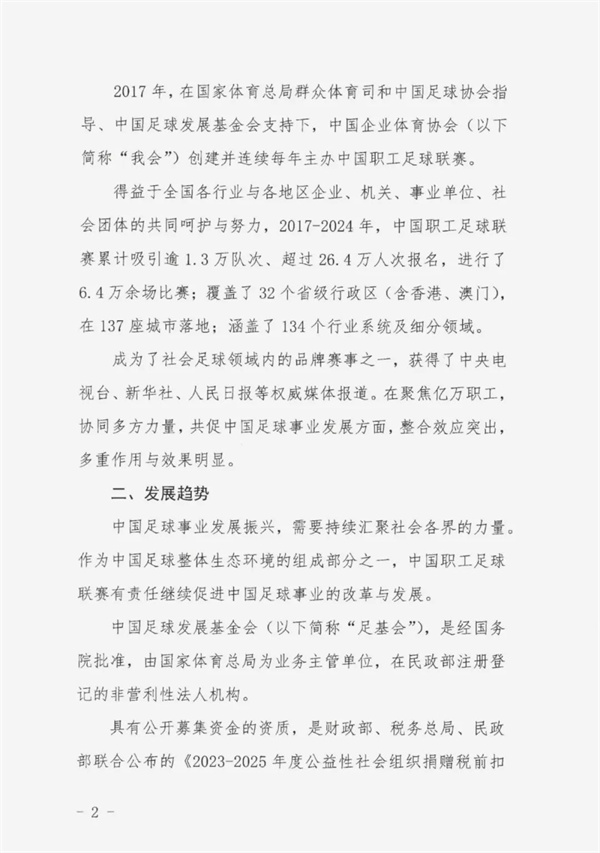 为深入贯彻落实《中国足球改革发展总体方案》(以下简称“《足改方案》”,助力中国足球事业发展振兴,在中国职工足球联赛发展并运行九年的基础上,优米下载app制定了《鼓励对2025年“全民健身 健康中国”第九届中国职工足球联赛进行社会资金捐赠及计划遴选一部分赛事予以基础补贴的实施办法(试行)》(以下简称“《实施办法》)(附件1),现正式印发。