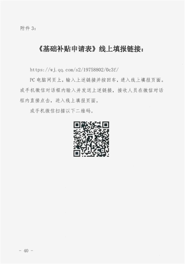 《基础补贴申请表》线上填报链接:https://wj.qq.com/s2/19758802/0c3f/