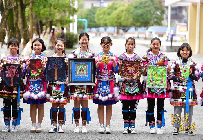 △2019年3月22日,广西融水苗族自治县民族中学女童班的学生展示刺绣作品。